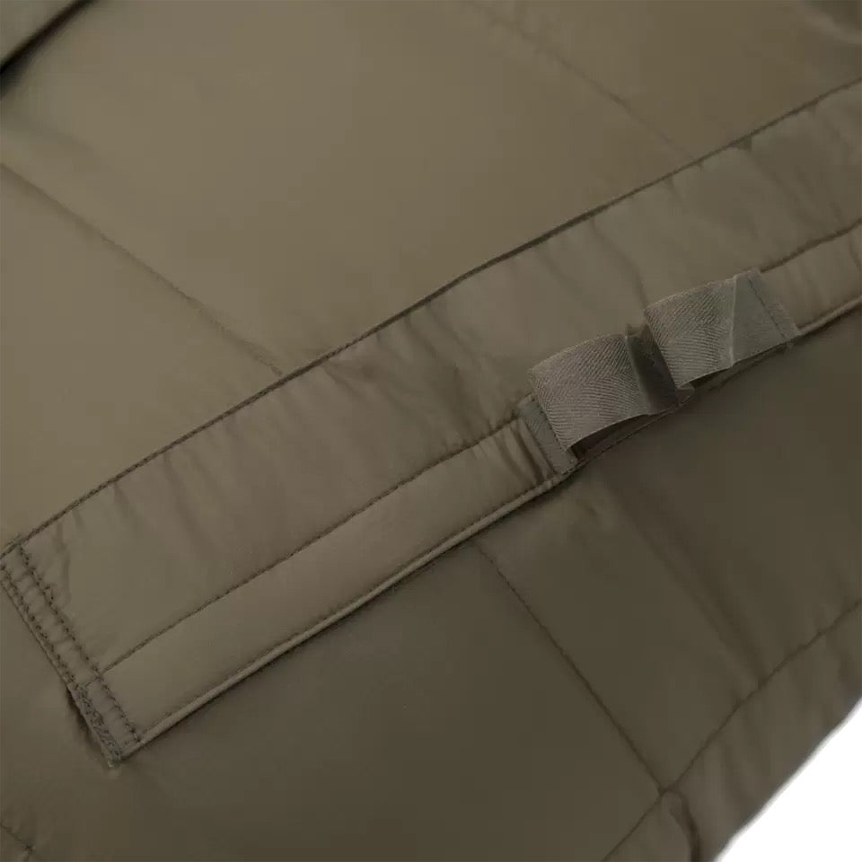 Water-Resistant Shell: The outer shell is made from Durable Water-Repellent (DWR) fabric, which protects the down fill from moisture while also offering durability and resistance to harsh environmental conditions.